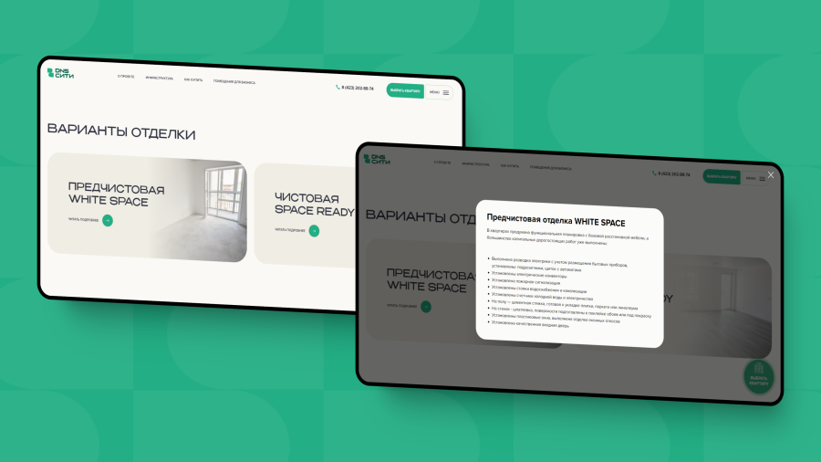 Первый квартал описан в информационных карточках, которые появляются по клику на слайдеры. То же самое мы провернули с вариантами отделки квартир: во всплывающих окнах подробно расписаны отличия предчистового и чистового ремонта от застройщика.