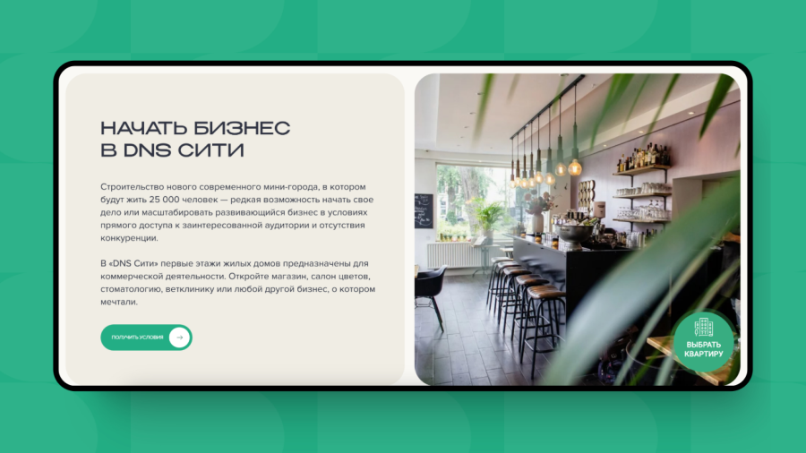 Микрорайон строится по принципу «город в городе»: большая часть первых этажей домов будет занята коммерческой инфраструктурой. Чтобы привлечь внимание бизнеса к новому городу, сделали отдельный блок с конкурентным описанием и кнопкой целевого действия для связи с отделом продаж.