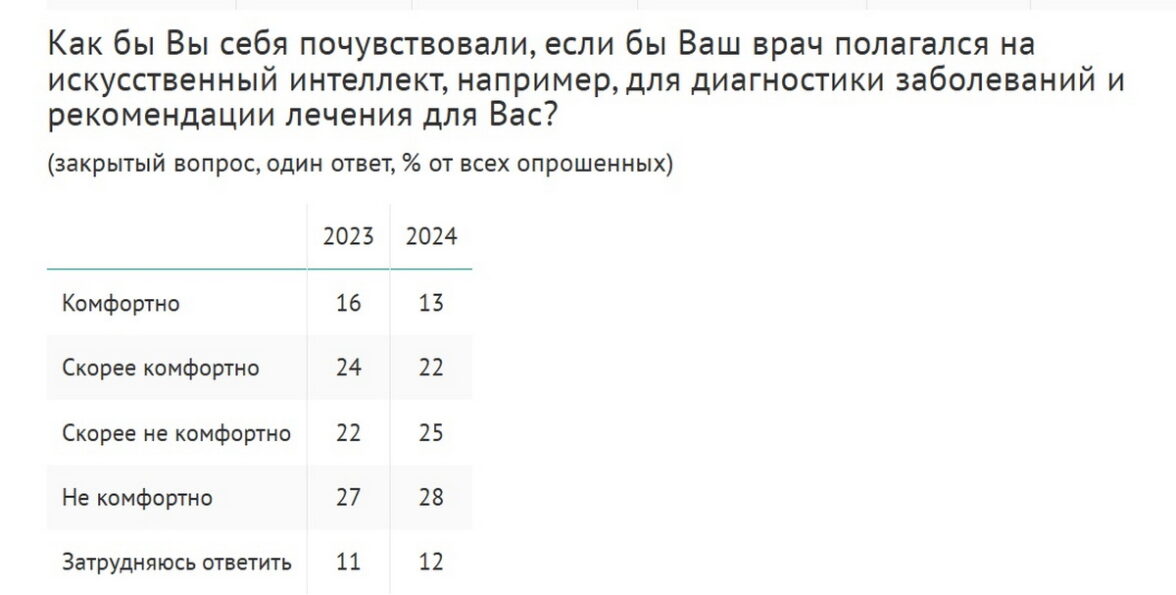 Лишь 13% россиян почувствовали бы себя комфортно, если бы их лечащий врач полагался на искусственный интеллект для диагностики заболеваний и рекомендации лечения. 22% — скорее комфортно. 25% — скорее некомфортно. 28% — некомфортно. Притом по сравнению с 2023 годом число тех, кому было бы комфортно и скорее комфортно, незначительно снизилось — в общей сложности на 5 процентных пунктов.