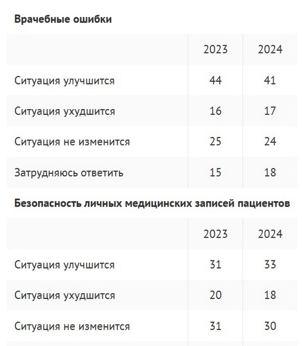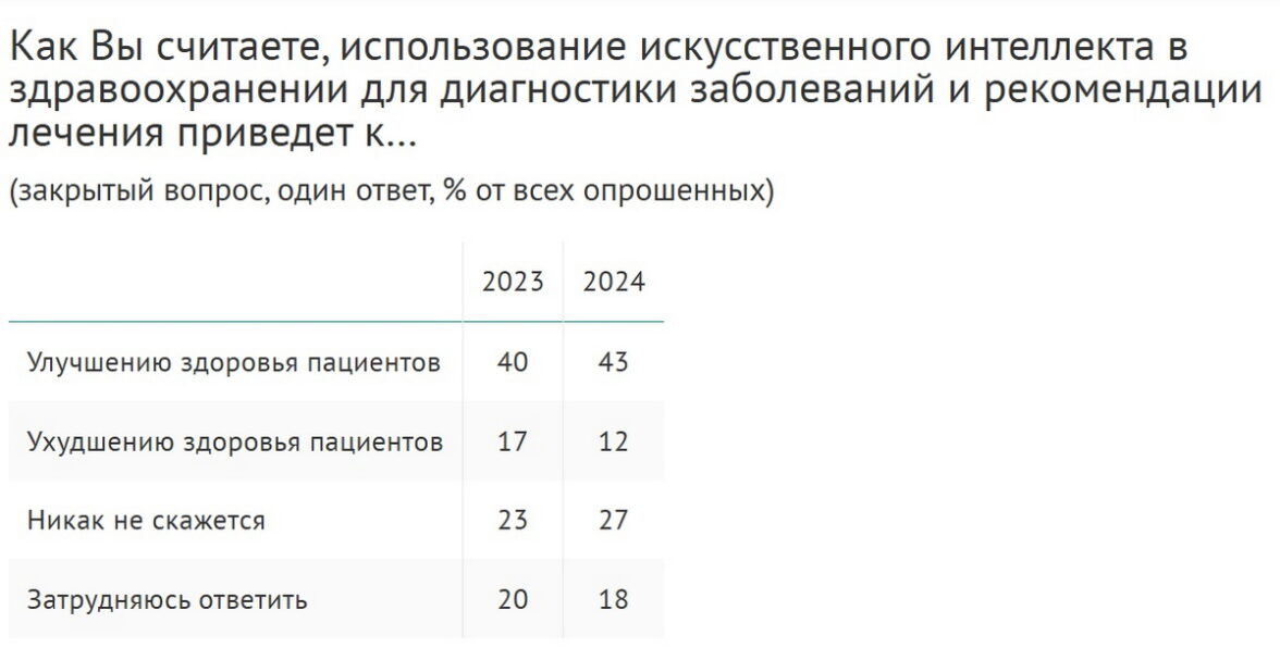 В 2024 году по сравнению с прошлым годом выросло число россиян, положительно оценивающих использование ИИ в здравоохранении. Фразу «Как Вы считаете, использование искусственного интеллекта в здравоохранении для диагностики заболеваний и рекомендации лечения приведет к…» 43% опрошенных закончили словами «улучшению здоровья пациентов». В 2023 году такой ответ дали 40% опрошенных. 17% респондентов посчитали, что это приведет к ухудшению здоровья пациентов. Год назад такое мнение высказали 12% участников опроса. Выросло за год число тех, кто считает, что использование ИИ никак на здоровье пациентов не скажется — с 23% до 27%. Затруднившихся с ответом в 2024 году оказалось много — 18%, но все же больше, чем год назад, когда их было 20%.