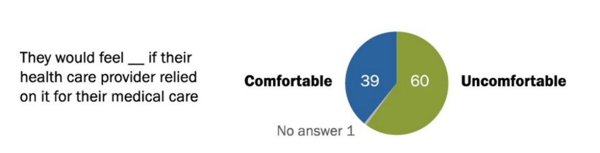 В аналогичном вопросе американского опроса не было вариантов со словом «скорее». Просто — «комфортно» (так ответили 39% респондентов) или «некомфортно» (такой ответ дали 60% опрошенных). Таким образом, врач, полагающийся на ИИ, не понравился бы большинству как россиян, так и американцев.