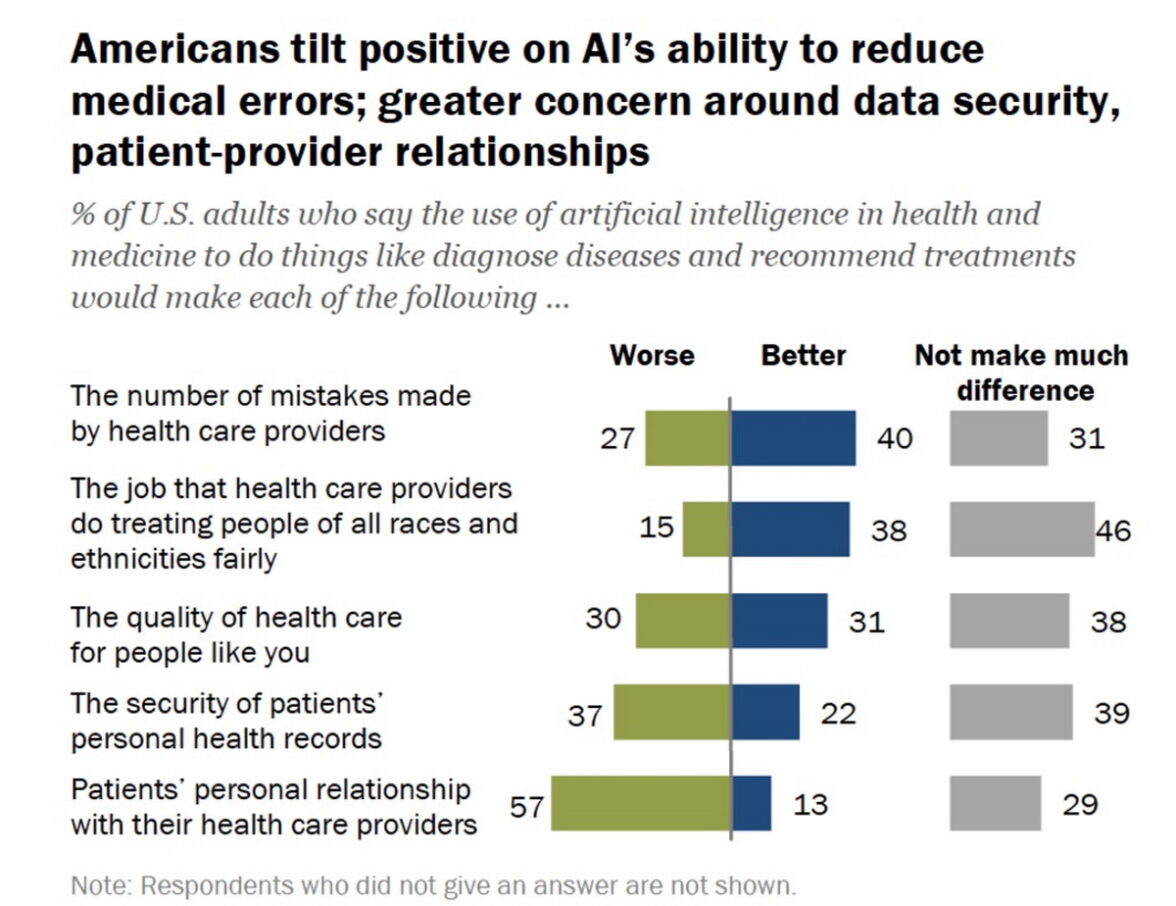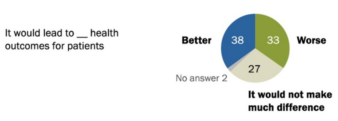 Посмотрим на результаты американского опроса. На вопрос, аналогичный заданному в опросе ВЦИОМ, 38% участников опроса Pew Research ответили, что использование ИИ приведет к улучшению здоровья пациентов. Это меньше, чем в России. 33% американцев заявили, что к ухудшению. А этот показатель почти вдвое выше российского. 27% ответили «не повлияет», что полностью совпадает с российским показателем. Не давших ответа среди участников американского опроса оказалось всего 2%.