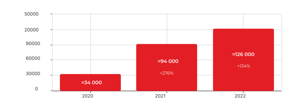Сводная статистика по визитам из поисковых систем в разрезе 2020, 2021, 2022 годов (График № 4). Каждый год поисковый трафик растет.
