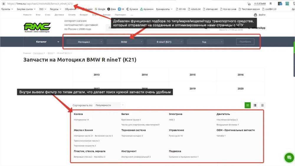 Большая база запчастей, в которой отмечена их применимость к модели мотоцикла — это большая редкость. Заказчиком была проделана огромная работа по сбору и внесению данных на сайт. Грамотное использование этих данных привело к отличным результатам!