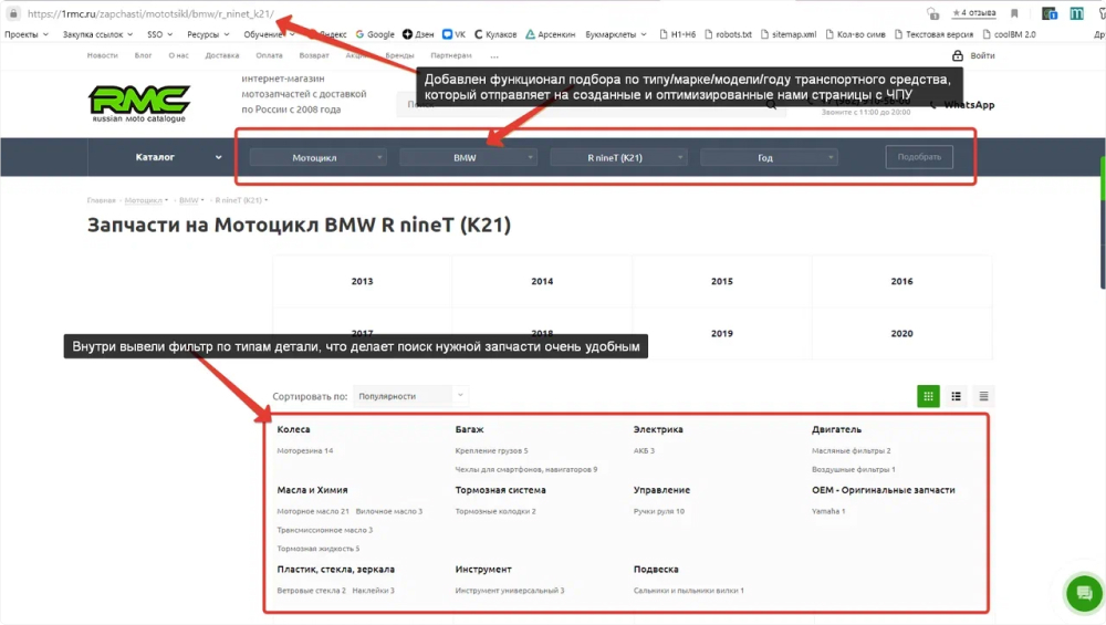 Поработали с более чем 30 000 страниц товаров: изменили и оптимизировали названия, метатеги и перелинковки товаров с учетом семантического ядра и сценариев поиска товара; перелинковали страницы товаров и страницы техники. Например: «Запчасти на мотоцикл BMW R nineT (K21)»; продвинули страницы товаров по артикулам запчастей (Скриншот № 4). Выбирали самые частотные артикулы и мониторили по ним позиции сайта в поисковых системах.