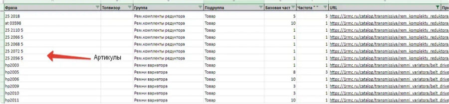 • Поработали с более чем 30 000 страниц товаров: изменили и оптимизировали названия, метатеги и перелинковки товаров с учетом семантического ядра и сценариев поиска товара; перелинковали страницы товаров и страницы техники. Например: «Запчасти на мотоцикл BMW R nineT (K21)»; продвинули страницы товаров по артикулам запчастей (Скриншот № 4). Выбирали самые частотные артикулы и мониторили по ним позиции сайта в поисковых системах.