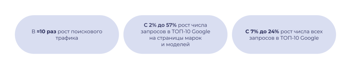 Создали новые посадочные страницы: более 146 разделов по собранному семантическому ядру (в ≈10 500 ключей); изначально на сайте был только один каталог «По типу детали» (Скриншот № 2). Если клиенту нужна была запчасть под конкретный транспорт, найти ее было очень сложно; создали страницы по типу, марке, модели и году транспортного средства (Скриншот № 3).
