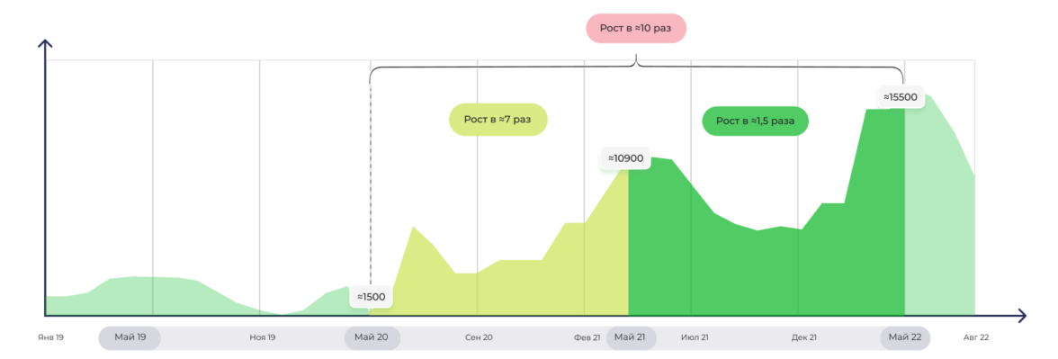 График № 2. Рост поискового трафика с начала нашего продвижения ≈в 10 раз. Сравниваем май 2020 года с маем 2022 года
