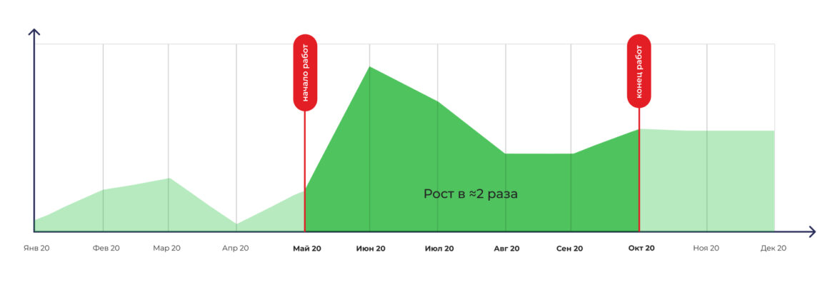График №1. Рост поискового трафика в период нашего продвижения (май 2020 — октябрь 2020) в ≈2 раза