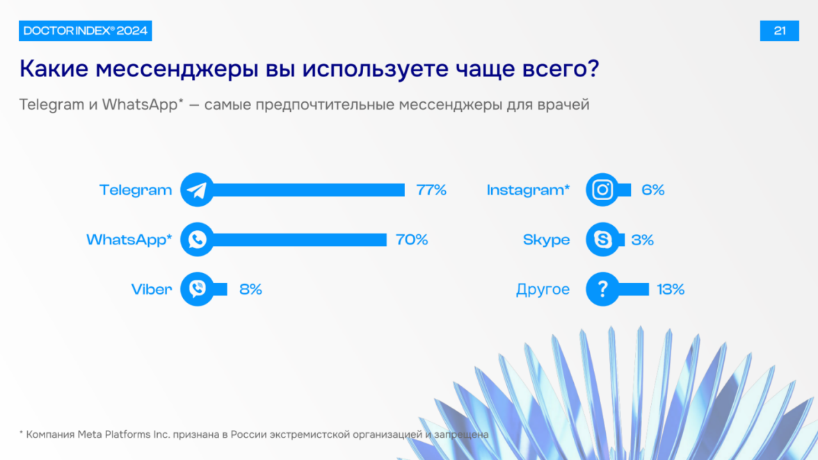 К созданию tg-бота мы пришли не случайно. Так, в ежегодном исследовании Doctor Index® по итогам 2024 года Telegram лидирует среди мессенджеров и его популярность продолжает расти.