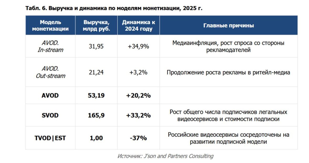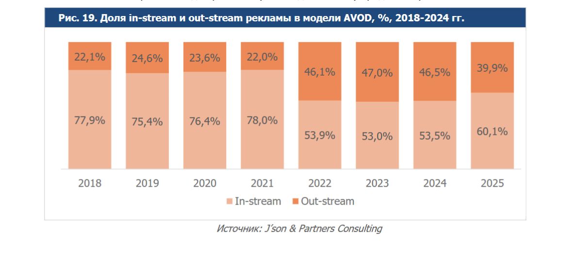 Внутри рекламного сегмента после резкого роста в 2022 году доли рекламных форматов, которые не показывают непосредственно в видеоконтенте, а размещают на интернет-странице (out-stream), структура рынка начала возвращаться к докризисной. Если в 2022 году доля такой рекламы составляла 46,1%, то в 2025-м сократилась до 39,9%. Реклама в потоковом видео (In-stream), которую показывают внутри видеоконтента, напротив, нарастила долю с 53,9% в 2022-м до 60,1% в 2025-м. Авторы отчета считают, что рекламодатели вновь начали использовать рекламу в видеосервисах для брендинговых кампаний, а не для активаций, нацеленных на краткосрочные результаты.