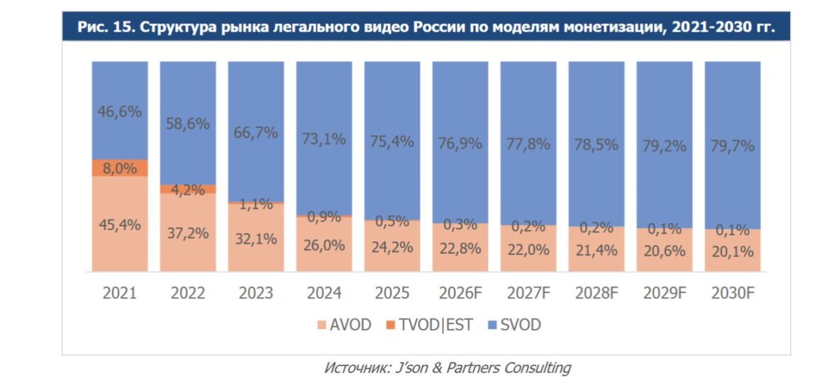 Заметный на мировом уровне тренд развития рекламной модели монетизации (advertising video on demand, AVOD) в России не проявляется, утверждают авторы отчета. Доля доходов подписок в выручке стабильно растет. В 2021 году она составляла 46,6%, в 2025-м достигла 75,4%, а к 2030 году составит почти 80% всего рынка, прогнозируют в J’son & Partners Consulting.