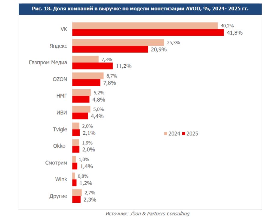 Тройка лидеров по доле рынка в рекламной модели монетизации не изменилась. VK укрепил лидерство, увеличил в долю с 40,2% в 2024 году до 41,8% в 2025-м. «Яндекс» сохранил второе место, но потерял 4,4 процентных пункта (п.п.) — получил 20,9%. Напротив, доля видеоактивов «Газпром-Медиа» увеличилась на 3,9 п.п. — с 7,3% до 11,2%.