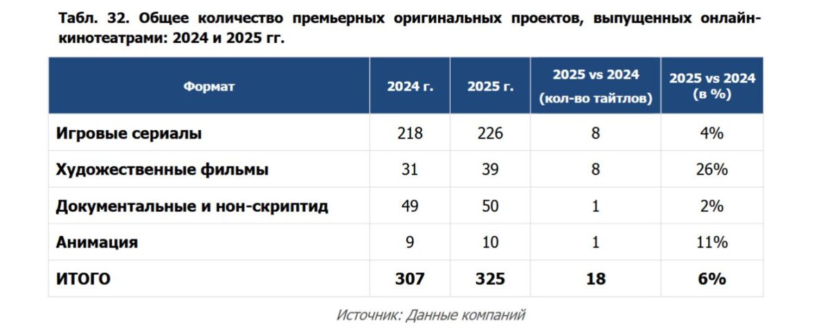 Чтобы конкурировать за платящих подписчиков и удерживать аудиторию, российские стриминги увеличили производство оригинальных фильмов и сериалов. В 2025 году на отечественных платформах вышло 325 премьерных оригинальных проектов — на 18 больше, чем в 2024 году. Из них 226 — игровые сериалы. Именно на сериалы пришлось около 70% всего нового контента, выпущенного российскими стримингами.