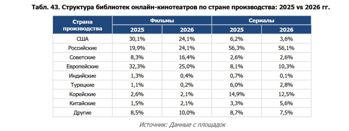 Рост количества собственных проектов изменил и структуру библиотек контента видеосервисов. Российские сериалы в 2026 году заняли более 56% от всех многосерийных проектов в каталогах, а доля американских составила всего 6%. В этой категории увеличился процент проектов европейского и китайского производства, а сериалы из Турции и Южной Кореи теряют долю.