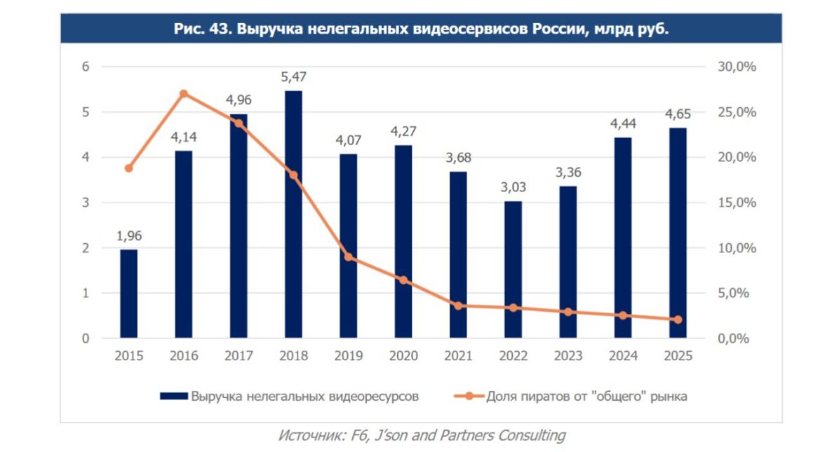Не будь видеопиратов доходы легальных видеосервисов были бы выше. По оценке J’son & Partners, в 2025 году пиратские платформы собрали рекламы на 4,65 млрд рублей (+5%). Правда, доля нелегальных видеоплатформ в общей выручке видеосервисов (легальных и пиратских) постоянно снижается: в 2025 году она составила 2,1% против 2,5% в 2024-м. В 2021-м этот показатель составлял 3,6%, а в 2016-м — 27%.