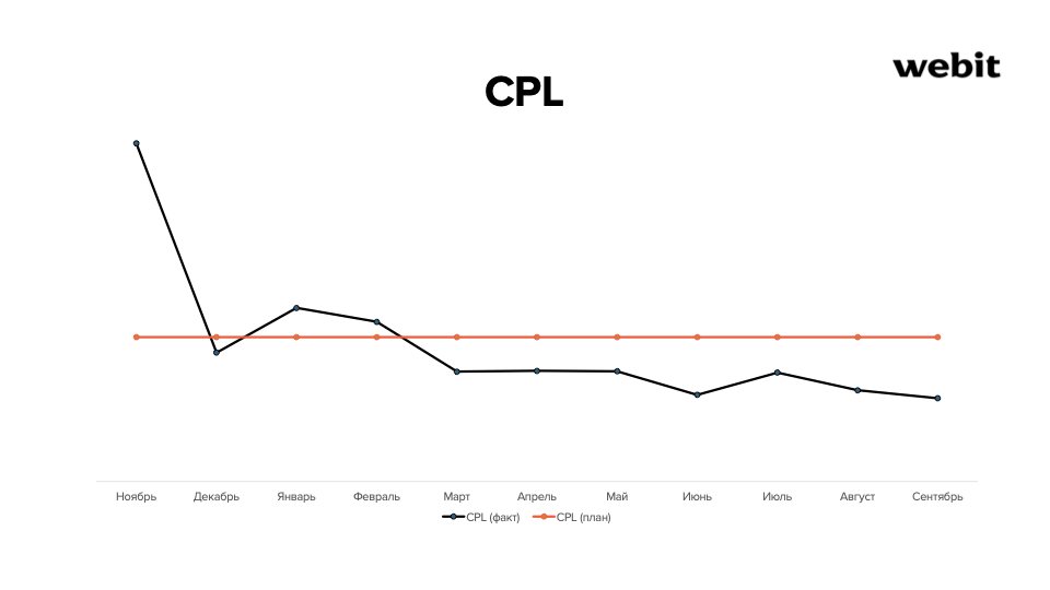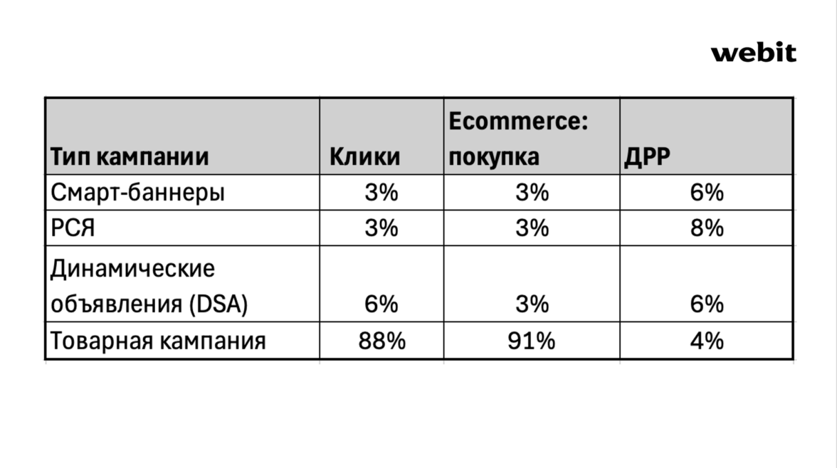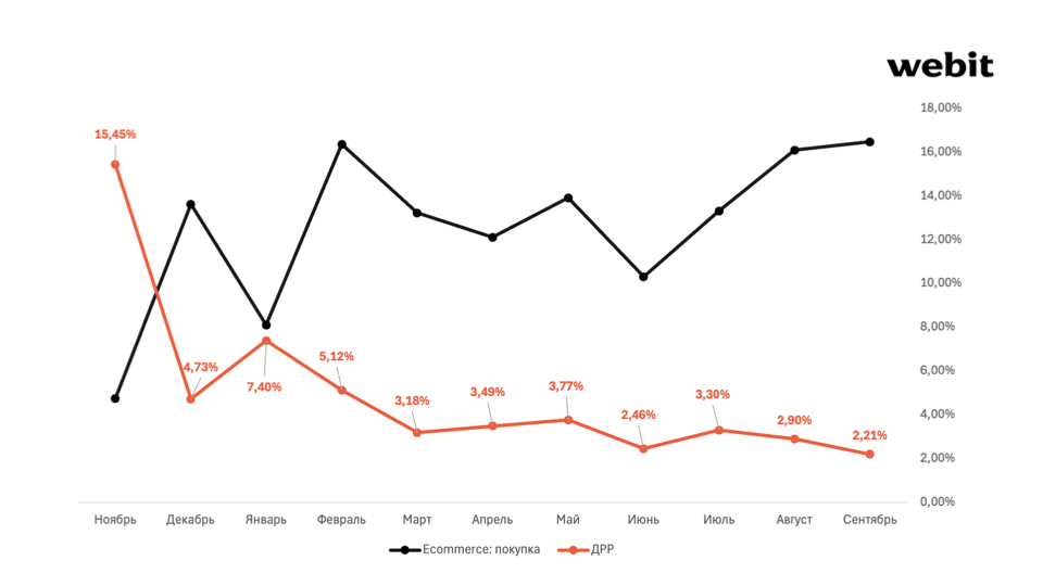 ДРР составлял не более 7%, тогда как, по опыту Webit, в B2B-сегменте он варьируется от 10% до 22%;
