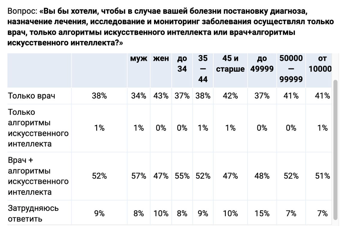 Готовы обойтись полностью без врачей, вручив свое драгоценное здоровье ИИ-технологиям, только мужчины старше 35 лет, зарабатывающие более 100 тысяч рублей в месяц.
