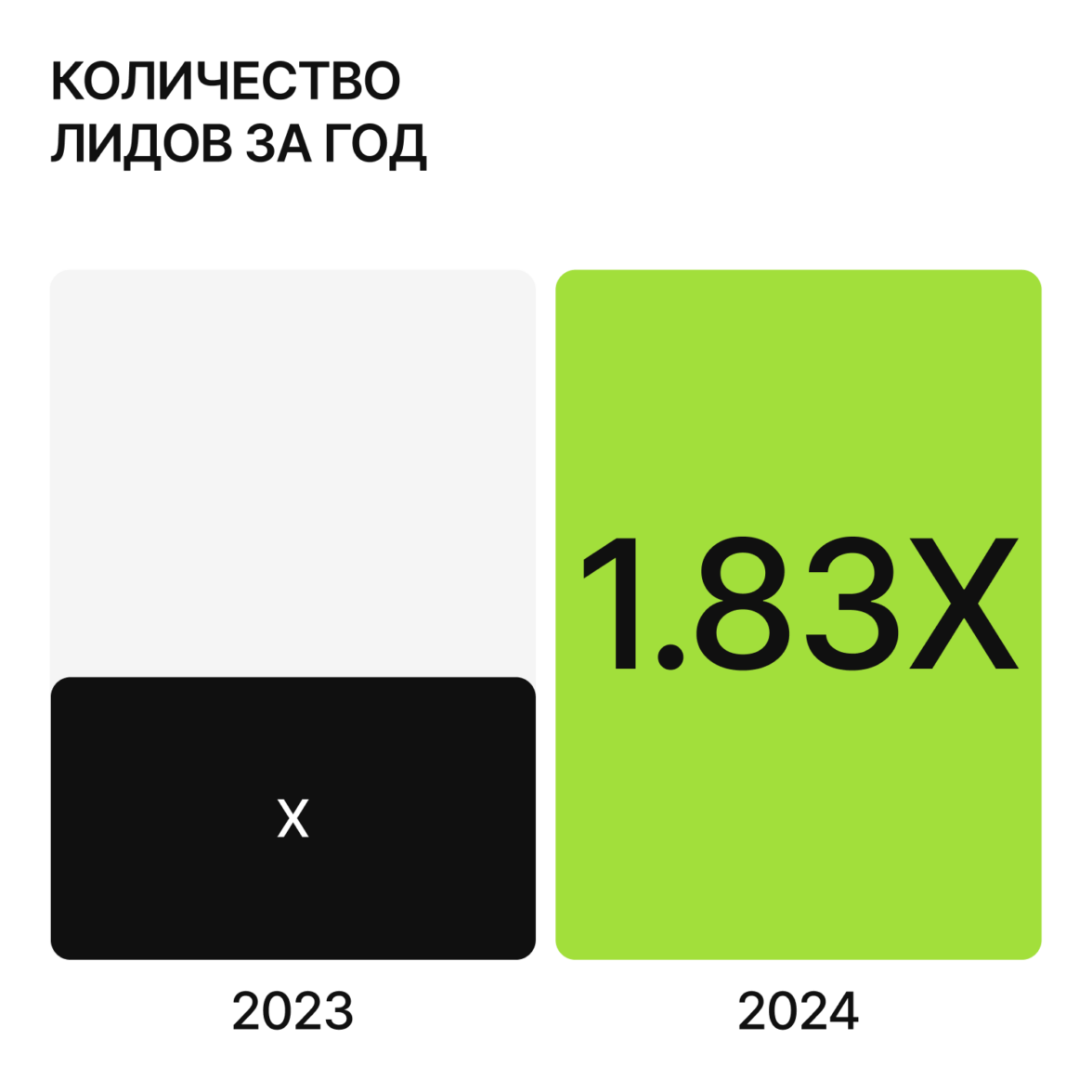 Третий график визуализирует рост общего числа лидов — за год их количество увеличилось в 5,14 раза. Такой результат стал возможен благодаря комплексному подходу к стратегии продвижения, включая работу с SEO, контекстной рекламой и аналитикой.