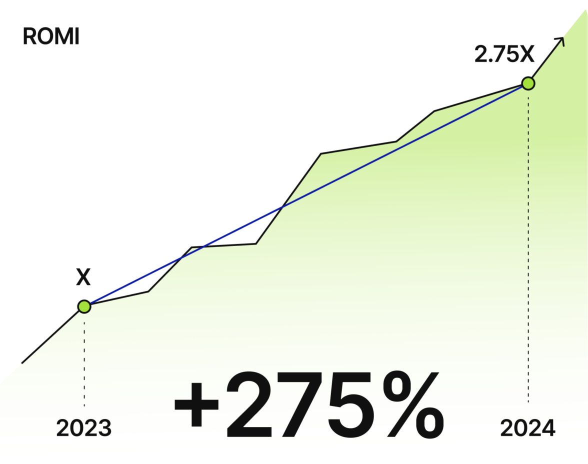 На первом графике видно, как ROMI увеличился на 275%. Это стало возможным благодаря стратегическому подходу к таргетированной рекламе: перераспределению бюджета, созданию персонализированных креативов и оптимизации воронки продаж.