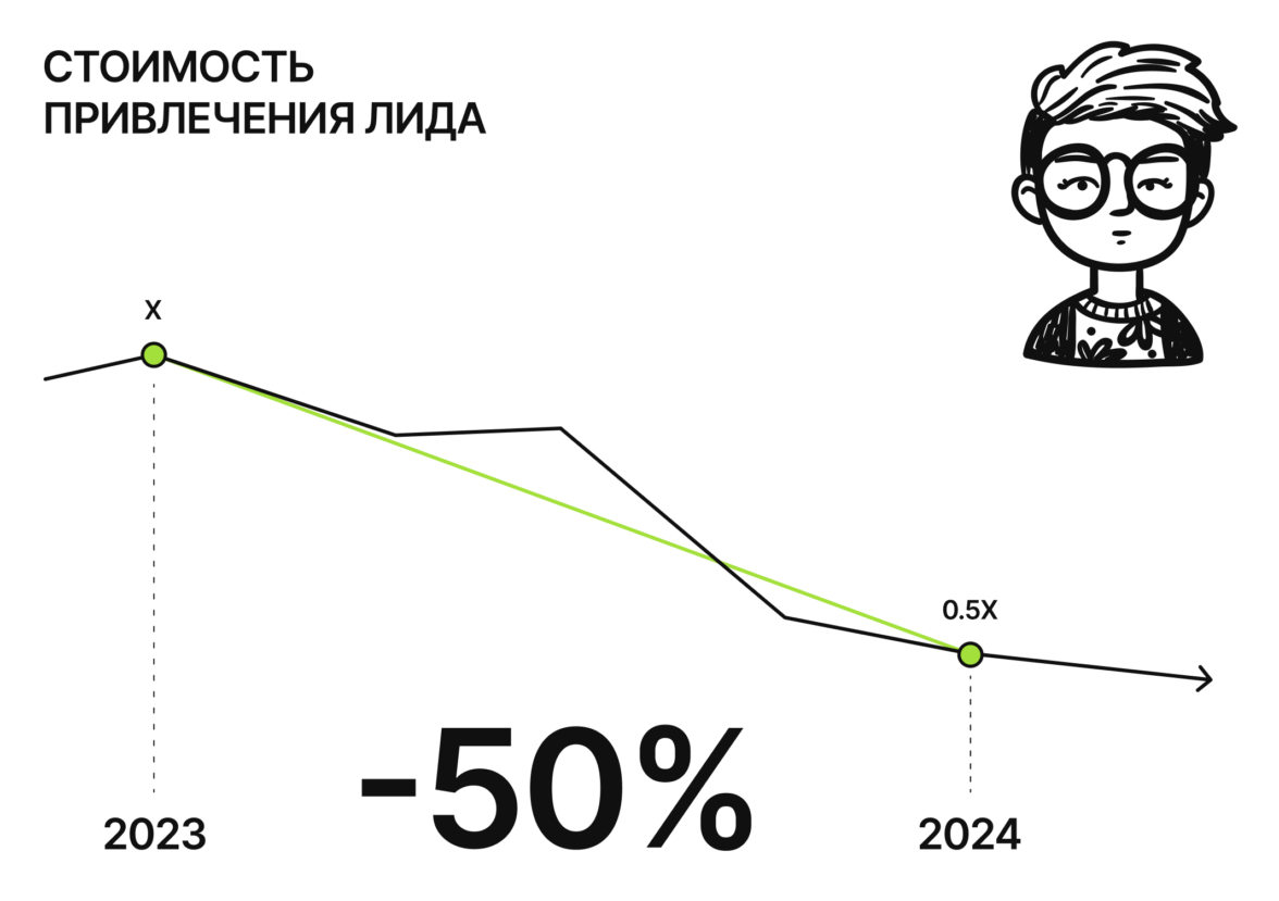 Первый график демонстрирует рост ROMI на 460%, что отражает значительно увеличившуюся отдачу от вложений в digital-каналы. Второй график показывает снижение стоимости привлечения лида на 73%, благодаря эффективной настройке и оптимизации рекламных кампаний. Это позволило значительно снизить расходы при сохранении высокой конверсии.