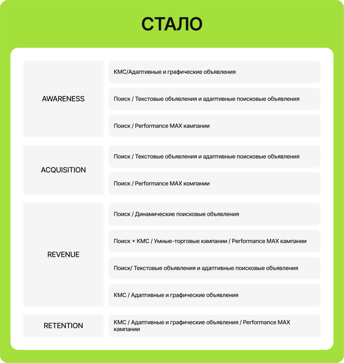 Создали новую структуру кампаний. Разработали стратегию на основе этапов воронки продаж (ознакомление, интерес, желание, действие) и настроили отдельные кампании для каждого этапа.