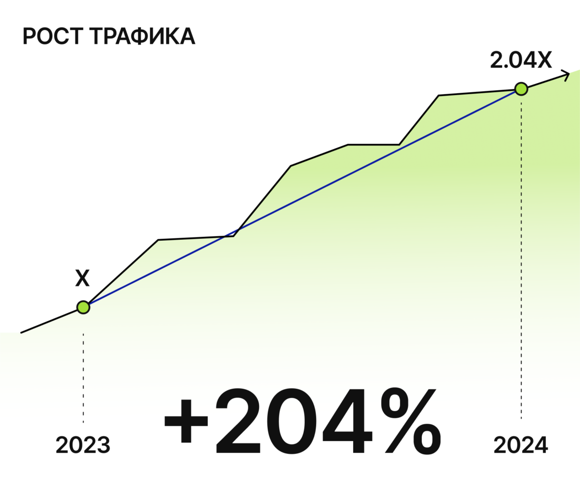 На третьем графике видно, как общий трафик вырос на 204%. Оптимизация структуры сайта, улучшение технических характеристик и внутренняя перелинковка способствовали увеличению видимости в поисковых системах, что привело к стабильному росту посещаемости и качественному привлечению новых пользователей.
