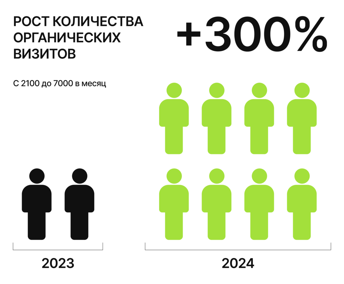 Второй график демонстрирует трёхкратный рост органического трафика: количество посетителей увеличилось с 2100 до 7000 в месяц. Это результат создания новых оптимизированных страниц, регулярного размещения статей и пресс-релизов, а также активного ведения блога с качественным и релевантным контентом.