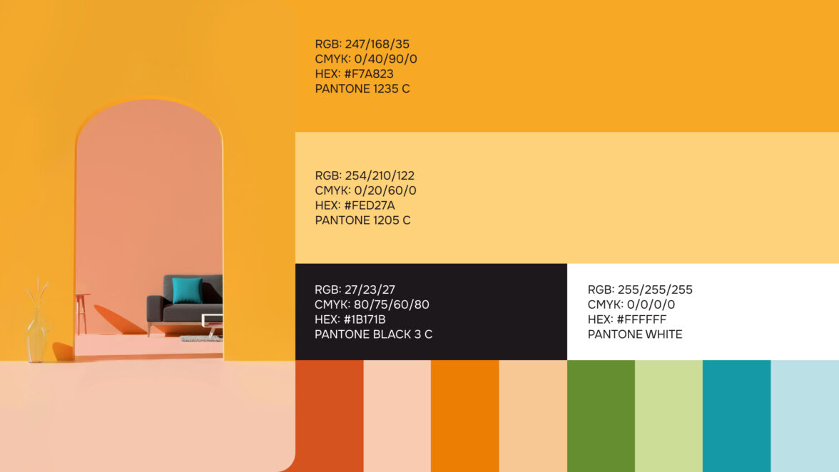 Фирменные цвета относятся к спокойной и теплой гамме и предусматривают вариативность: палитра позволяет создать узнаваемый стиль, но при этом выстроить цветовое кодирование для ассортимента бренда. Дополнительно разделить категории помогают визуальные элементы маскота: например, прическа и поварский колпак.