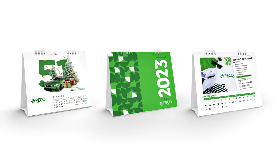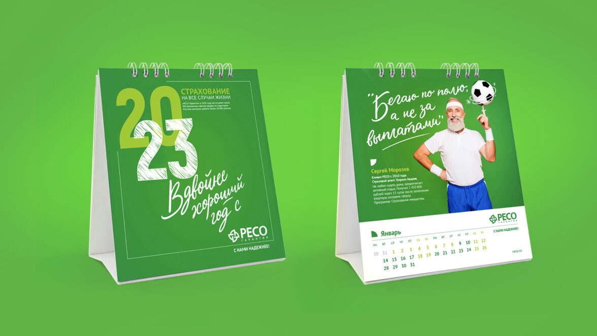 Дизайн календаря выполнен в фирменной зеленой гамме, отражающей спокойствие и уверенность, а слоганы раскрывают УТП и ценности компании. С «Ресо» — вдвойне хороший год!