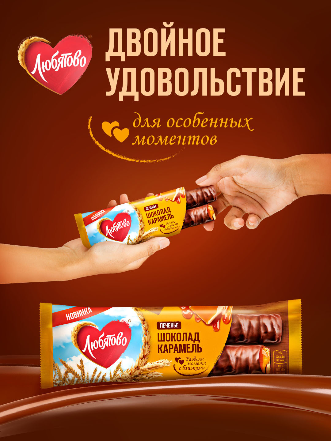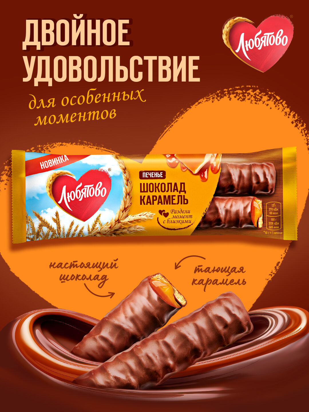 Продуктовую зону на упаковке расширили, что позволяет потенциальному покупателю мгновенно представить содержимое и сформировать ассоциацию с вкусным угощением к чаепитию. Детализированные изображения продукта: хрустящее печенье, тягучая карамель и шоколадная глазурь — напоминают известный аналог, что вызывает аппетит и желание попробовать новинку от «Любятово».