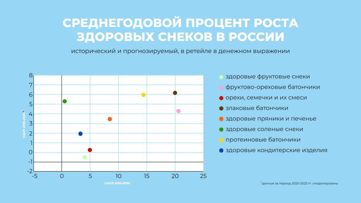 По данным аналитики DS1, продажи снеков, некоторое время находившиеся в кризисном состоянии, будут восстанавливаться между 2023 и 2027 годами — это создает большие перспективы для брендов, которые привлекут новую аудиторию и предложат нетипичный для рынка подход. В том числе это относится к семечкам с необычными вкусами — более бюджетному варианту, чем орехи, спрос на которые падает из-за высокой цены.
