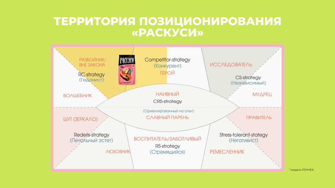 В результате анализа команда DS1 branding определила позиционирование семечек «Раскуси»: современный перекус для тех, кто умеет сохранять баланс между стабильностью и желанием пробовать новое. Открытый, дерзкий и драйвовый характер бренда уживается с традициями и устоявшимися представлениями о качестве продукта, что позволяет поддержать интерес разных сегментов аудитории. В результате бренд создает восприятие кросс-категорийного продукта на стыке нестандартных снеков и привычных семечек.