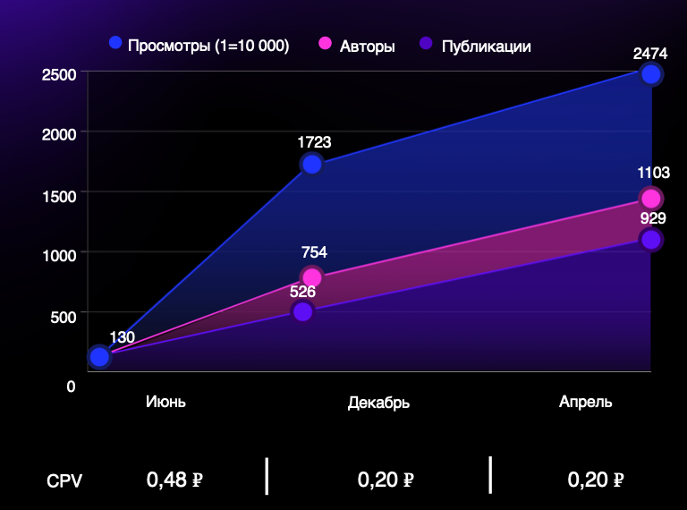 Сотрудничество с креаторами, доверяющими нам, снизило стоимость при росте охвата и лояльности. За 10 месяцев мы добились того, что просмотры увеличились в 8,5 раз благодаря 1103 авторам, выпустившим 929 единиц контента, а CPV снизился более чем в 2 раза.