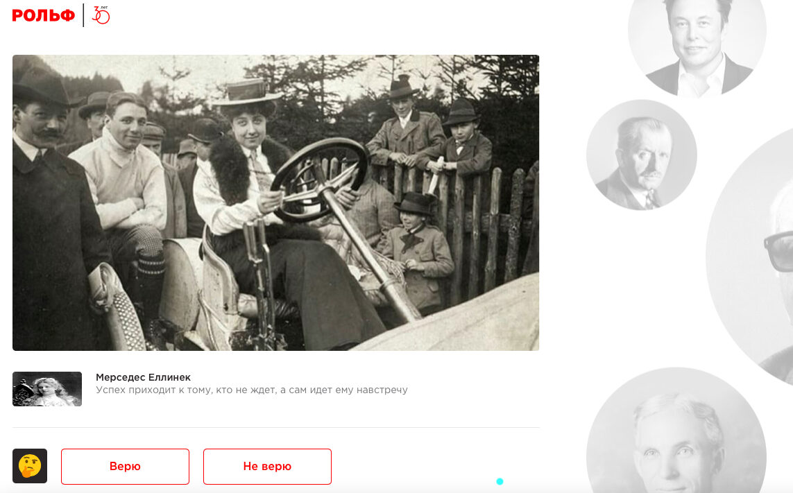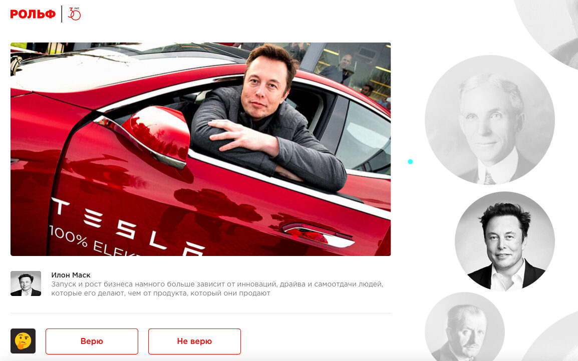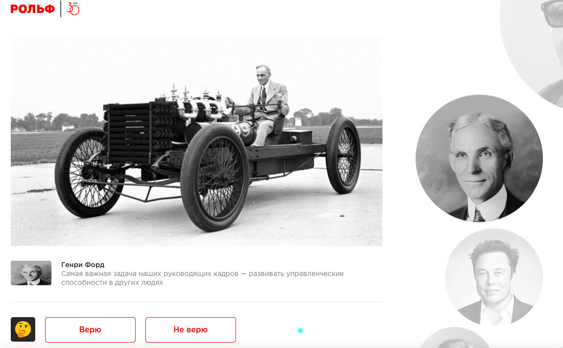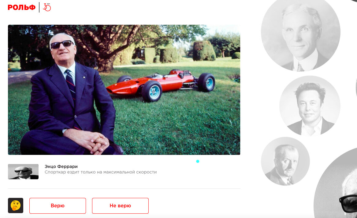 Среди массы возникших идей две показались самыми перспективными: обыграть автомобильную отрасль как сложный инженерный продукт и провести аналогию с качествами людей. Или показать через цитаты и мемы связь участников активности с великими людьми, которые когда-то создали автомобили. Действительно, многие автоконструкторы становились лидерами мнений, писали бизнес-бестселлеры, их идеи актуальны до сих пор.
