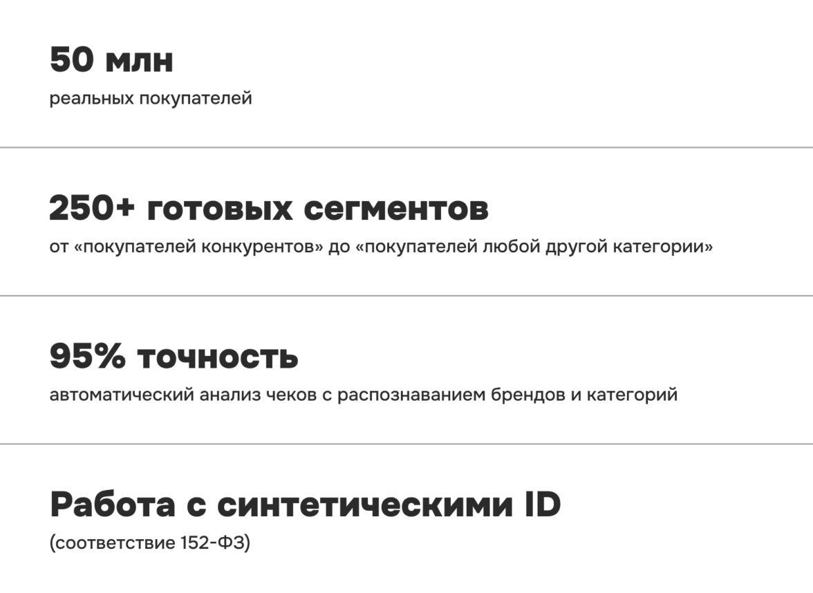 В отличие от стандартных CDP, здесь сегменты — это не просто люди по интересам, а реальные покупатели, которые, как и мы с вами, регулярно совершают онлайн-покупки. Система ежедневно получает и агрегирует данные о транзакциях из 50+ интернет-магазинов.