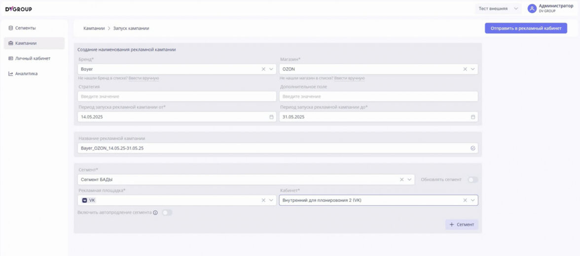 DV Platform позволяет напрямую подключить рекламные кабинеты VK и Яндекс для эффективного управления кампаниями. Готовые сегменты можно добавлять в рекламные кампании в один клик. Аудитории будут обновляться самостоятельно еженедельно, но эту функцию можно отключить.