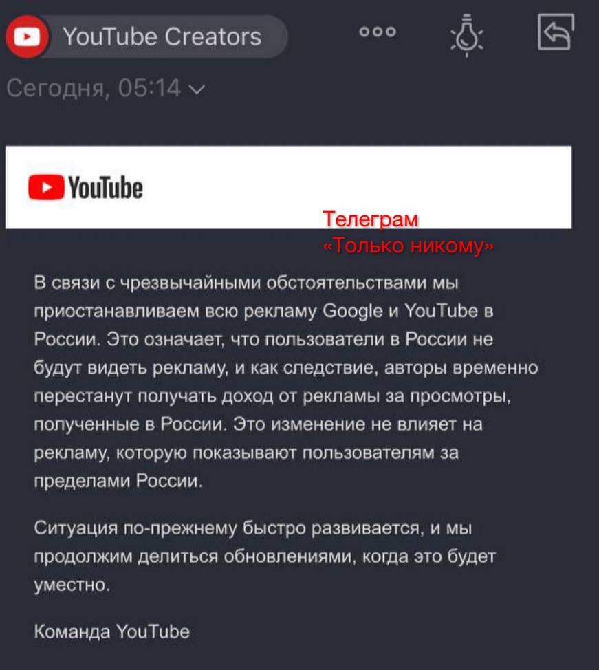 Утром YouTube разослал российским видеоблогерам письмо с уведомлением об отключении монетизации за просмотры, полученные в России.