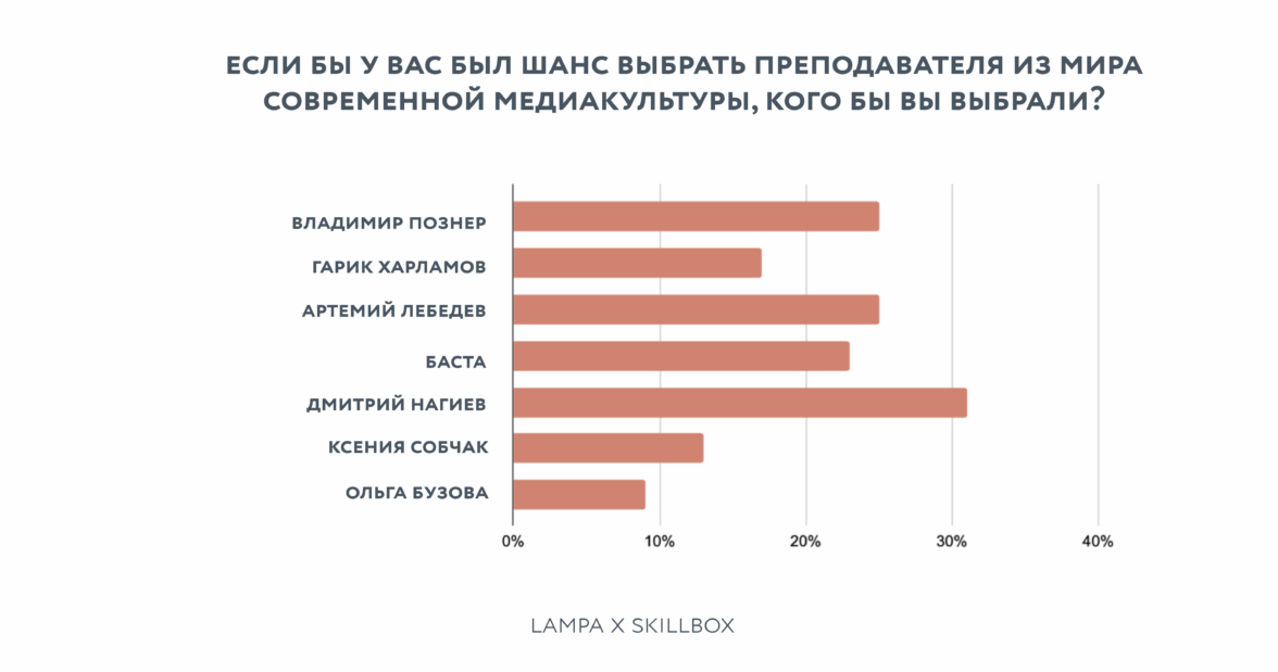 В медиакультуре лидером стал Дмитрий Нагиев (32%), которого ценят за харизму и жизненный опыт. Однако россияне 45–54 лет чаще выбирали Владимира Познера, видя в нём образ мудрого мыслителя.