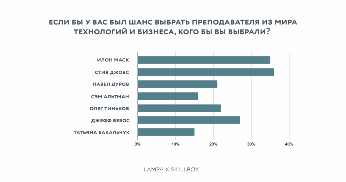 Сфера технологий и бизнеса ожидаемо оказалась за лидерами IT-эпохи: на первом месте Стив Джобс (36%), за ним Илон Маск (35%) и Джефф Безос (27%). Но здесь есть возрастные различия: россияне 25–34 и 45–54 лет чаще выбирали Джобса, тогда как остальные склонялись к Маску.