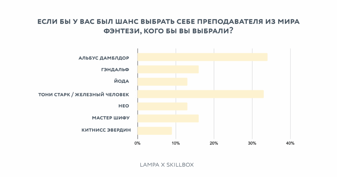 В мире фэнтези россияне чаще всего выбирали Альбуса Дамблдора (34%) и Тони Старка (33%) — два образа, которые символизируют баланс мудрости и технологичности. Любопытно, что среди миллениалов (35–44 года) Старк вышел на первое место, отражая восхищение поколений предпринимательскими и инженерными навыками.