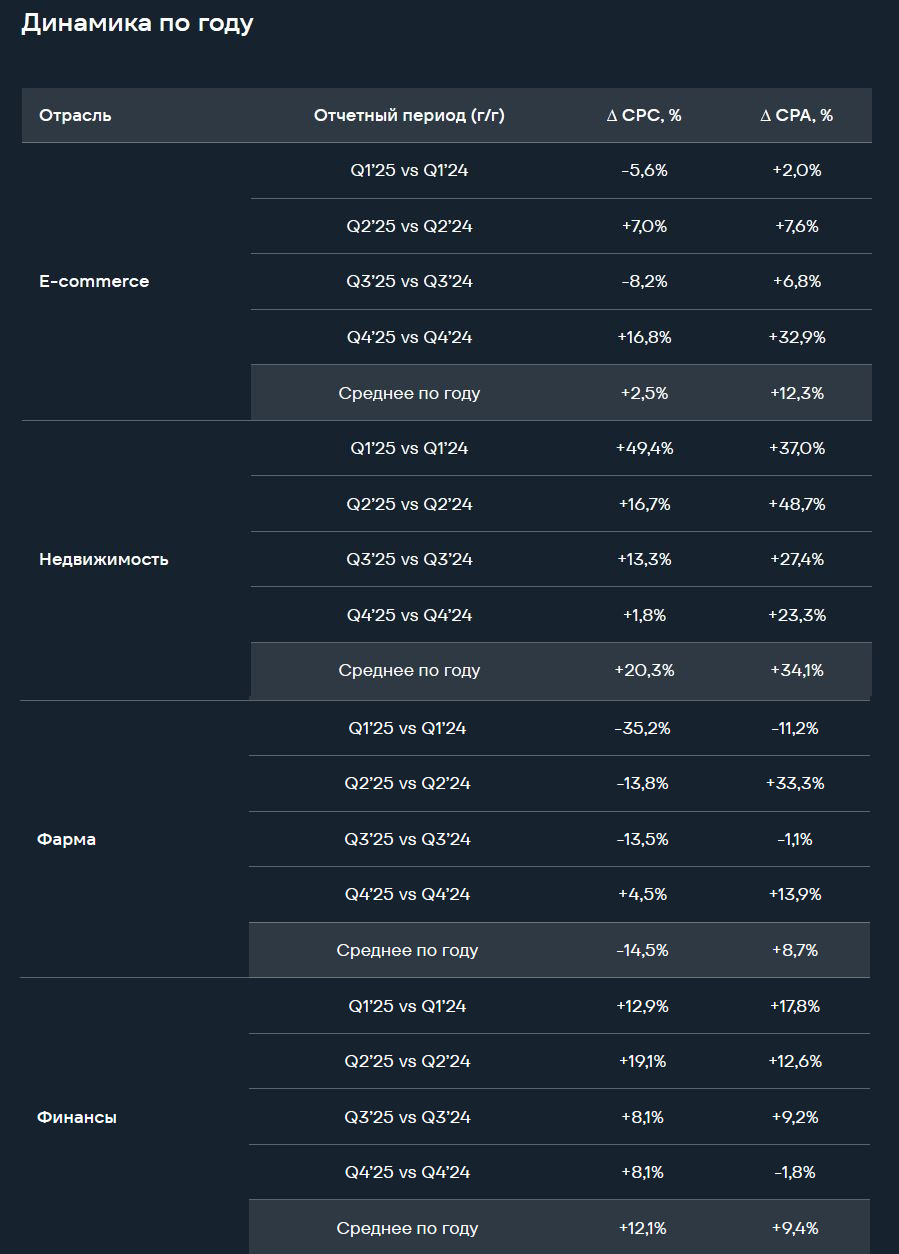 E-Promo рассчитывает показатели в четырех категориях рекламодателей — e-com, финансы, фармацевтика и недвижимость. Наиболее значительный рост стоимости конверсии (CPA) в 2025 году зафиксирован в недвижимости (34,1%). В электронной коммерции показатель составил 12,3%, в финансовом секторе — 9,4%, в фармацевтике — 8,7%.