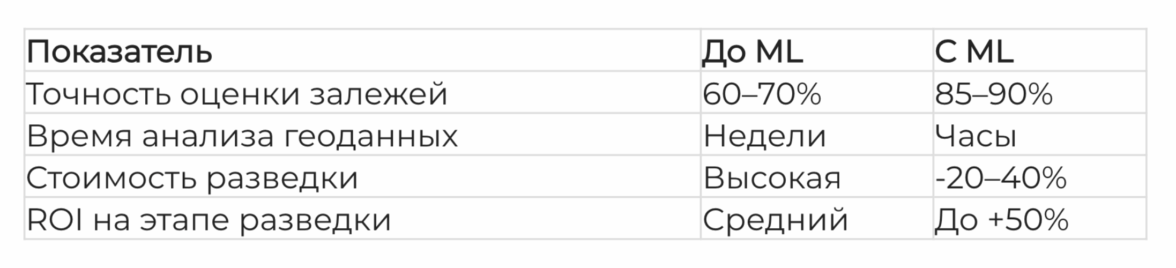 Поддержка принятия управленческих решений. ML-инструменты становятся частью геоинформационных панелей, позволяя руководителям быстро сравнивать участки по ключевым метрикам (запасы, риски, CAPEX) и принимать обоснованные финансовые вложения. Это критично для крупных проектов, где ставка на неправильный участок может обернуться многомиллионными убытками.