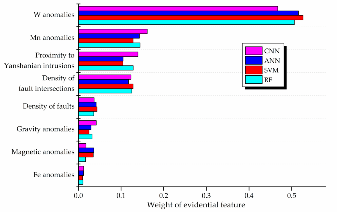 Веса, полученные путем прироста информации, указывающие на вклад каждой доказательной характеристики в прогнозы, MDPI