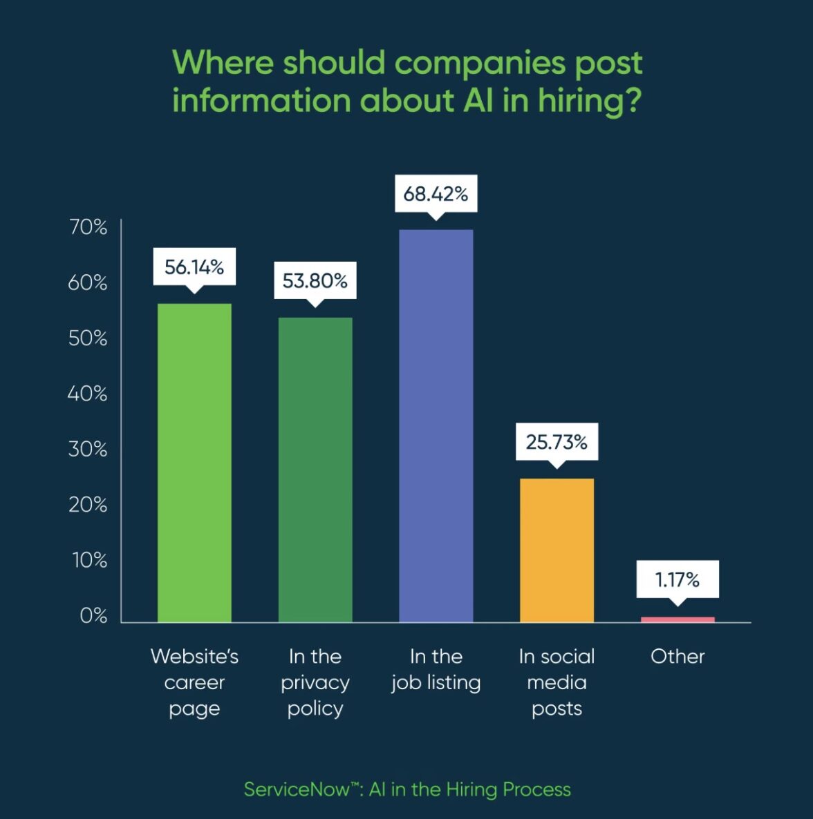 Безусловно, при таком настрое соискатели хотели бы видеть предупреждение о том, что компания использует ИИ в рекрутинге.Чуть более двух третей опрошенных (68,42%) считает, что такое предупреждение должно присутствовать в объявлении о вакансии. Чуть более половины хотели бы, чтобы такое объявление было на сайте компании в разделе о карьере (56,14%) и в политике конфиденциальности компании (53,8%). Примерно каждый четвертый (25,73%) хотел бы видеть предупреждение об ИИ в постах в соцсетях.