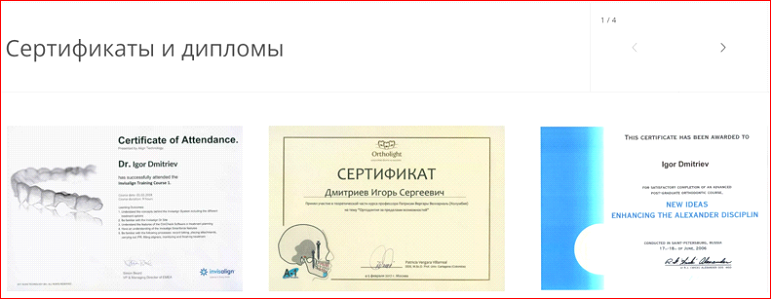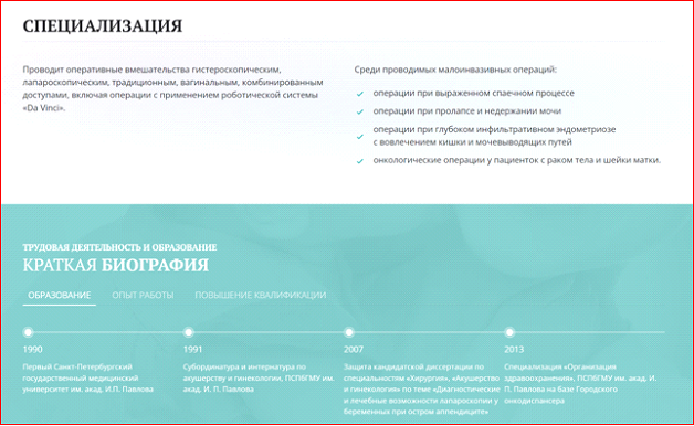Страницы и профили врачей и подробной информацией об их регалиях, опыте, достижениях.