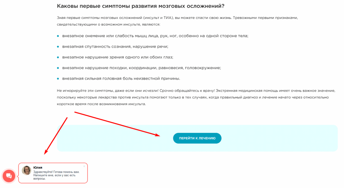 Здесь и кнопка перехода на страницу услуги, и виджет обратной связи «Напишите нам»