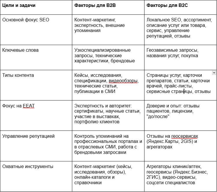 Потребности и поведение целевой аудитории в сегментах B2C и B2B различаются. Ключевая цель SEO и контента в B2B — запрос коммерческого предложения, партнерство. В B2C — заявка, звонок, запись на прием, покупка препарата. Соответственно, факторы оптимизации для обоих типов бизнеса тоже будут разными.