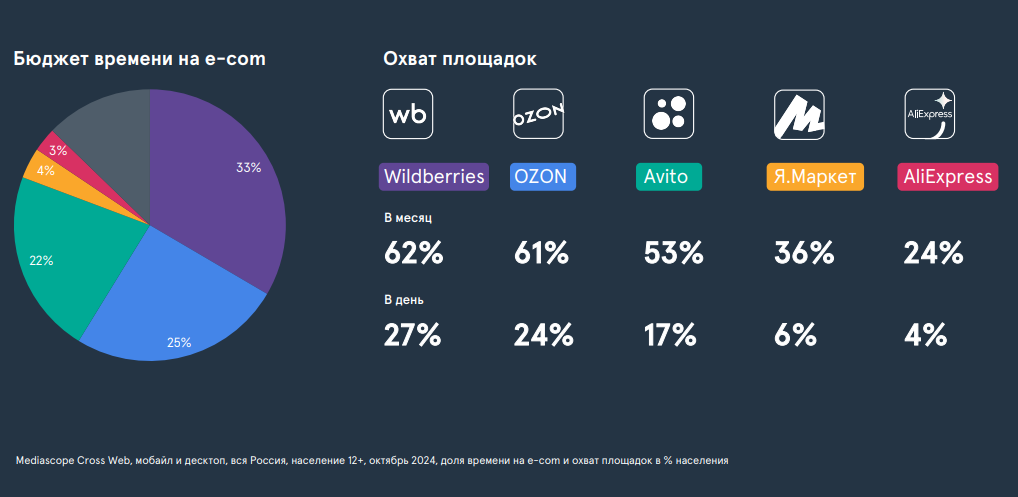 По свежей оценке Ассоциации развития интерактивной рекламы (АРИР) объем рынка Retail Media в 2024 вырастет до 437 млрд. руб. В России платформы, которые изначально были ориентированы на e-commerce, пользуются наибольшей популярностью в качестве рекламного канала. В топ-3 по охватам, по версии исследовательской компании Mediascope за октябрь 2024 года, входят Wildberries, Ozon, Avito.