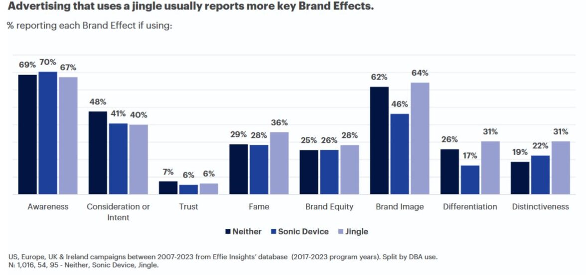 Одним из эмоциональных триггеров Effie и System1 считают музыку. Использование джинглов увеличивает эмоциональный отклик и узнаваемость бренда, они делают рекламу более узнаваемой. Реклама с джинглами увеличивает узнаваемость бренда на 31%, но, впрочем, никак не работает на осведомленность и намерение сделать покупку.